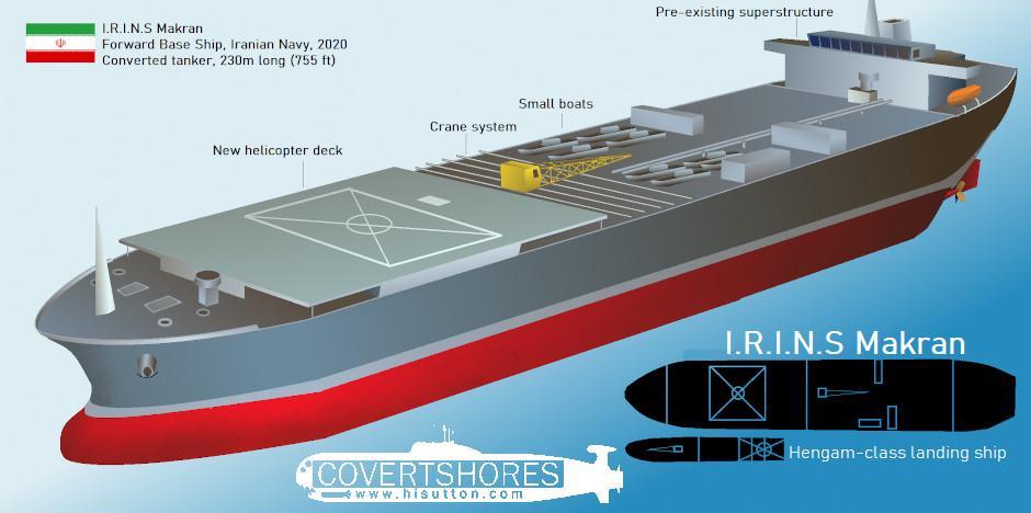 伊朗海军马卡兰号前进基地舰,该舰前身为阿芙拉型油轮波斯湾号(Persian Gulf),2009年下水,2010年交付,2020年被伊朗海军购入并开始改造,2021年1月12日入列伊朗海军。母港为伊朗海军主要基地阿巴斯港。