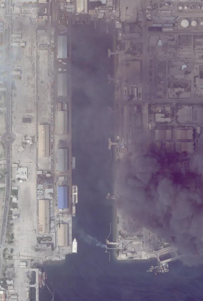 卫星图显示,马卡兰号前进基地舰停泊在阿巴斯港海军基地南端的一个泊位上,上层建筑右侧被命中并冒出了浓烟。上层建筑左侧也冒出了滚滚黑烟,这意味着该舰内部可能已经着火,且火势失去控制。集装箱船糟糕的抗损性可以判定该舰没救了。判断该舰为马卡兰号的原因为该舰舰首位置标志性的特大号直升机起降区。
